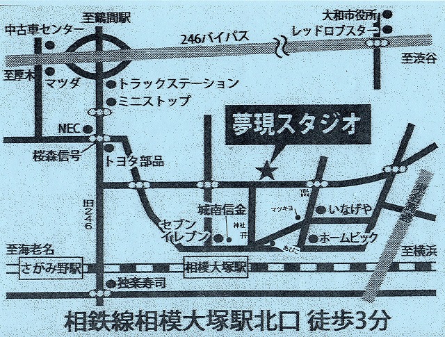 電車:相鉄線「相模大塚駅」北口、城南信金右側横断歩道を渡り、すぐ左側の桜森稲荷神社前直進。突き当り左側。
